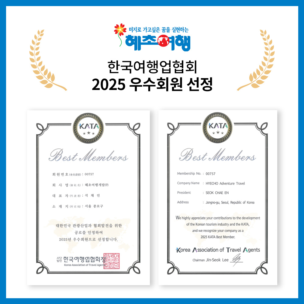 혜초여행사는 2025년 서울특별시관광협회 우수회원으로 2년 연속 선정 및 국제항공운송협회로부터 IATA 인가증명서를 부여받은 바 있습니다.