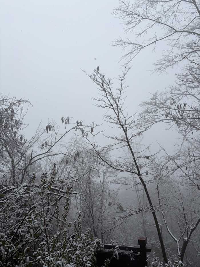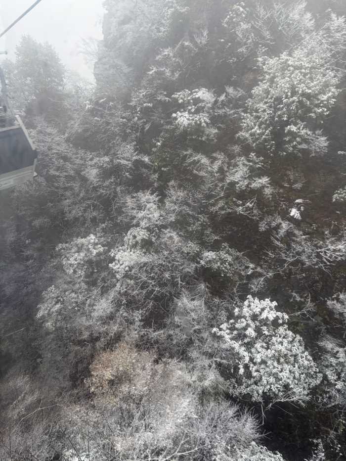 케이블카를 타고 이동하는 중 눈이 내렸습니다.