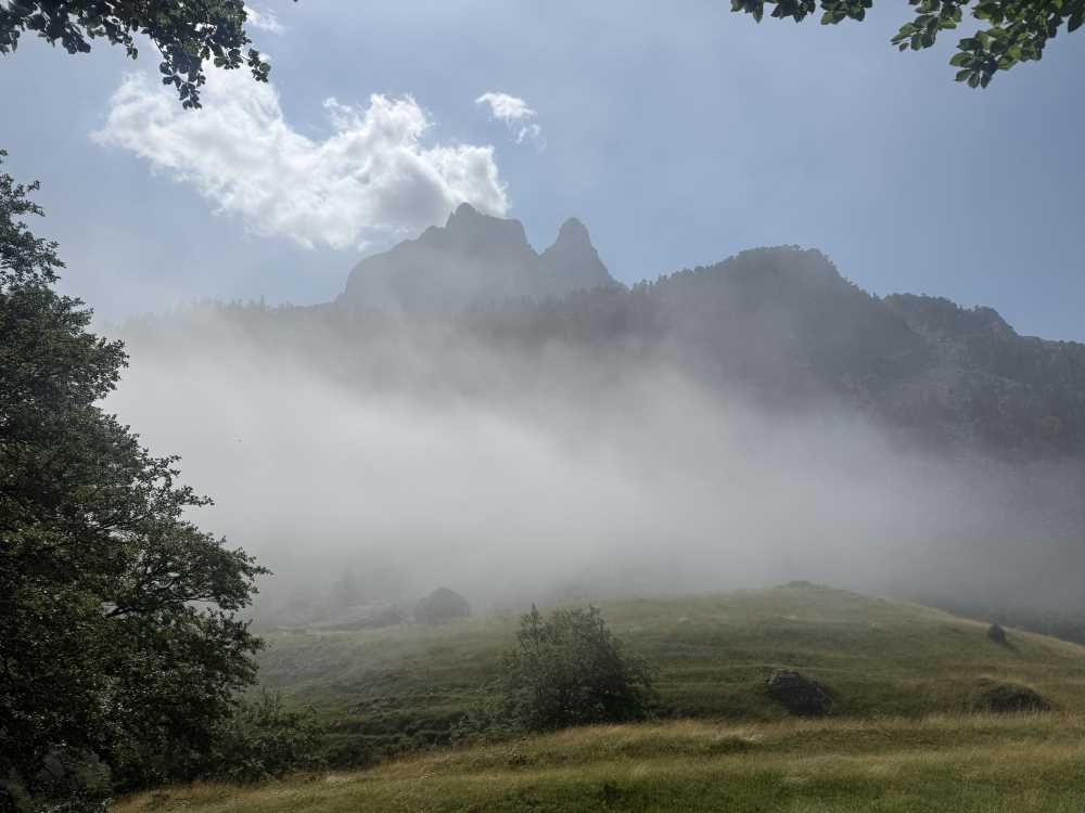 구름에 가려 아직 그 선명한 자태를 드러내지 않은 픽 뒤 미디 드 소우(Pic du Midi d’Ossau)를 마주하며