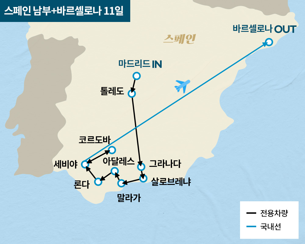 인천-두바이-마드리드-톨레도-그라나다-살로브레냐-말라가-아달레스-세테닐-론다-세비야-코르도바-세비야-바르셀로나-두바이-인천