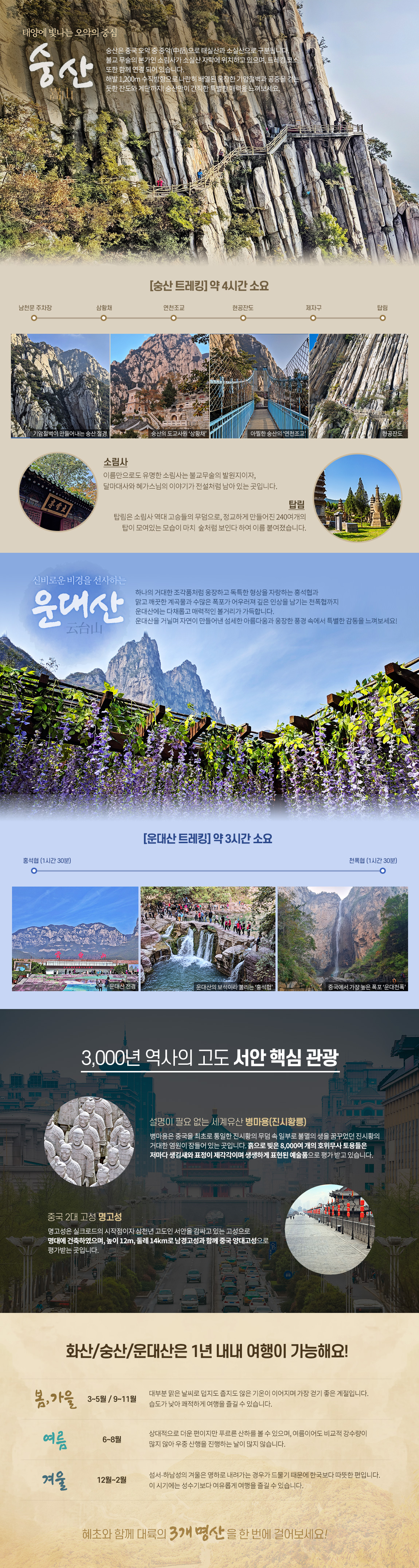 중국 5대 명산 중 2개인 화산,숭산과 신비로운 비경을 선사하는 운대산까지 걷는 여정입니다.