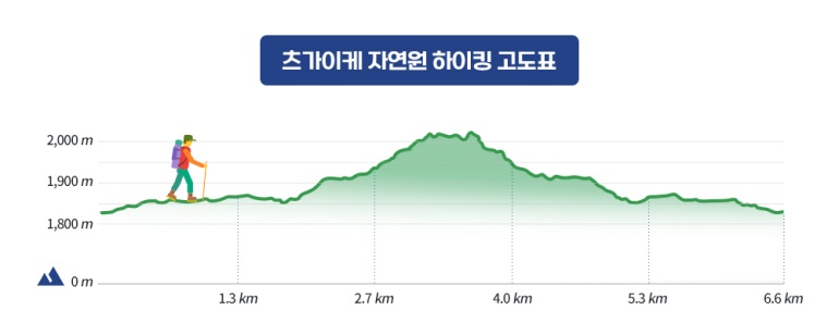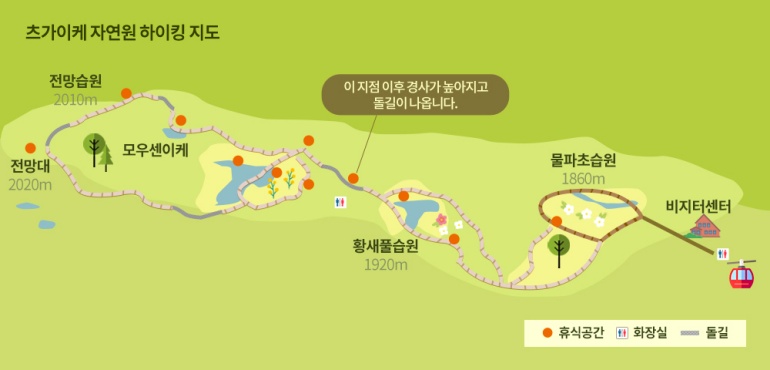 츠가이케자연원 비지터센터 - 물파초 습원(1,860m) - 우타스게 습원(1,870m) - 우키시마 습원(1,920m) - 전망 습원(2,010m) / *왕복 루트입니다.