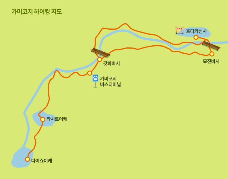 다이쇼이케 - 타시로이케 - 타시로/호다카바시 - 갓파바시 - 묘진바시 - 묘진이케 - 갓파바시 - 버스터미널-하이킹 종료
